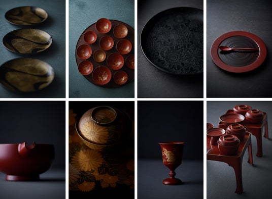 作品は、鈴木啓太氏が現地の方々と相談の上、セレクトされました。それらは、人間国宝の職人の方が手掛けた作品を含む、まさに輪島塗の真骨頂。息をのむ、緻密な技術と美しさが詰まっています。