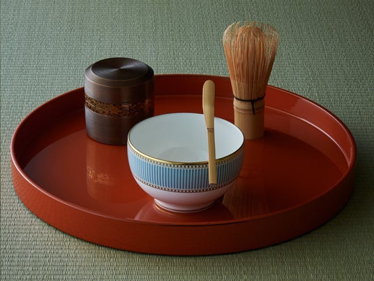 ウェッジウッド「フォーチュン」× 輪島塗「職人盃」「丸盆 尺一 洗朱面切」