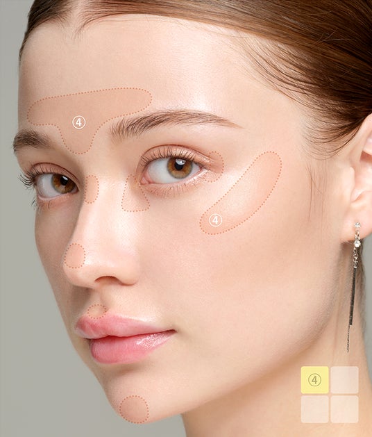 【How to Make】おでこや鼻のくぼみ、鼻先、頬骨の上、唇の山、あご先など高さを出したい部分や、 目頭や目尻などくすみを飛ばし光を集めたい部分に塗る。