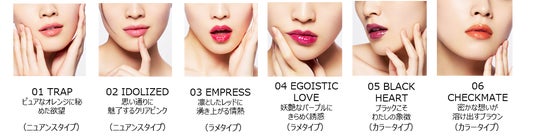本製品は、1人ひとりが内に秘めた本性・欲望を表情豊かに表現するために、色鮮やかな6色のカラー展開の中に、3段階の発色度合いのバリエーションをラインナップ。控えめに発色するニュアンスタイプ、鮮明に発色するカラータイプ、輝きをプラスするラメタイプをご用意しました。