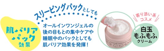 本商品はうるおいとハリ・弾力を与え、日中や睡眠中の乾燥・肌あれ・くすみをケアする肌バリアクリームです。テクスチャーは白玉のようなモフモフとしたクリームなっており、しっとりとお肌を守ります。スリーピングマスクとしてもオススメです。