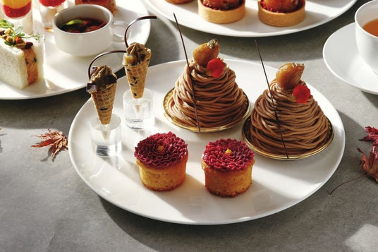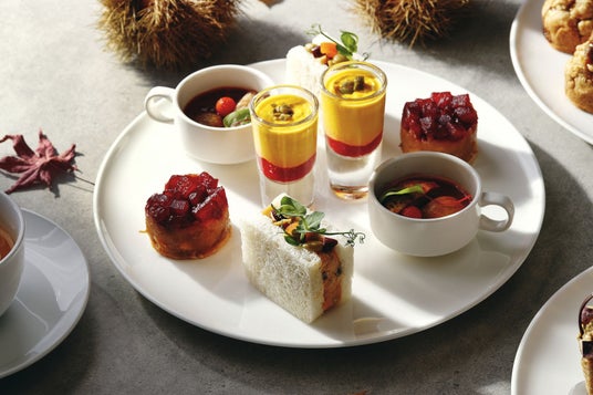 この秋に提供する「Vegan Mont Blanc Afternoon Tea」は、愛媛県の希少な「中山栗」を贅沢に使用した「ヴィーガンモンブラン」を主役に据えたスイーツ7種・セイボリー4種をご用意しました。スイーツは、ヴィーガンモンブランをショップでの販売サイズそのままにご提供するほか、自家製ビーントゥバーのガナッシュを挟んだサブレサンドや栗といちじくのスコーンなど、ペストリーシェフ・石和悟(いしわ さとる)のヴィーガンスイーツへのこだわりが随所に散りばめられた品々がお皿を彩ります。セイボリーは、ガラムマサラの香りを添えたかぼちゃのポタージュや栗を用いたシチューなどが並び、季節を感じる秋らしい一品一品をご堪能いただけます。