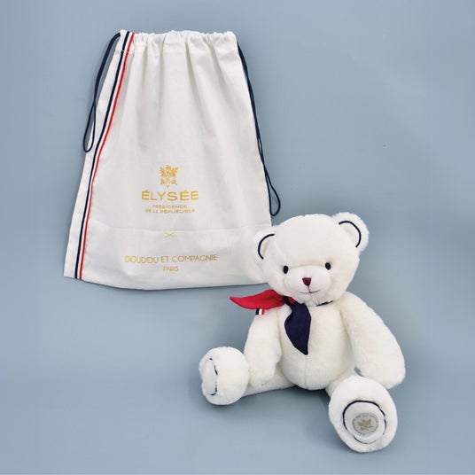 そんなドゥードゥー・エ・コンパニーから誕生したエリゼ宮とのコラボベアは、上質な生地、丁寧な縫製の追求から生まれた至極の逸品。ゴールドのコラボロゴにトリコロールのリボンがあしらわれた巾着付きです。フランス好きにはたまらない、気品が漂います。