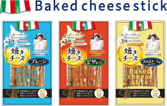 イタリアンの巨匠、アル・ケッチァーノ奥田政行シェフが監修し、奥田シェフオリジナルの旨味塩を使った焼きチーズ。フレーバーは味の違いが楽しめる「プレーン」「ピザ風」「カルボナーラ風」の3品。チーズは3種のチーズ(チェダー、クリーム、カマンベール)を贅沢に使用。