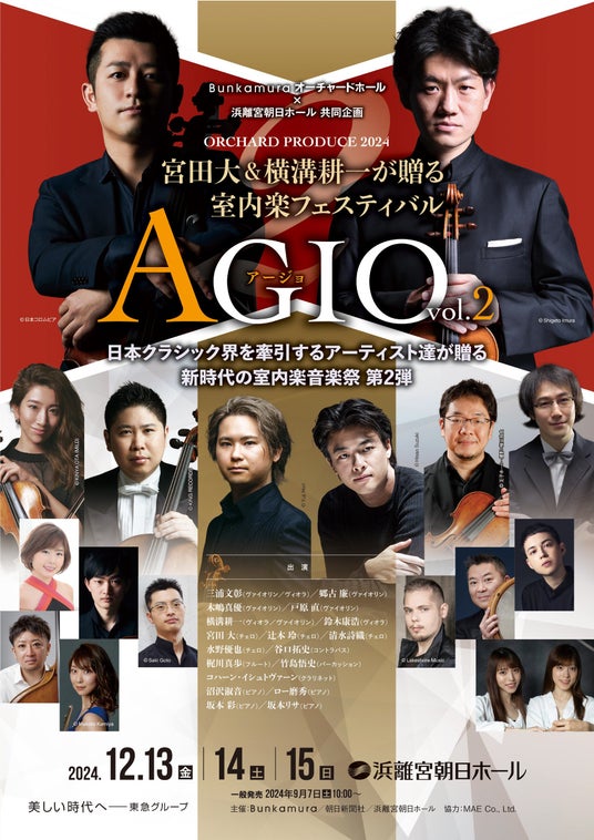 12月13日(金)~15日(日)に浜離宮朝日ホールにて、朝日新聞社・浜離宮朝日ホールとの共催企画として『宮田大&横溝耕一が贈る室内楽フェスティバル AGIO vol.2』の開催が決定しました。