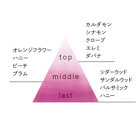 個性的で洗練されたスパイシーのトップから、フローラル・フルーティのしっとりとしたミドルへ。