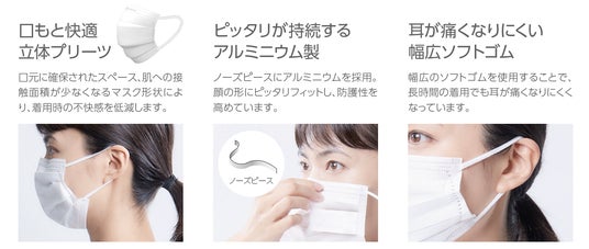 ノーズピースはアルミニウム製で、顔にぴったりとフィットし防護性を高めます。耳ひもには耳が痛くなりにくい柔らかい素材の幅広ソフトゴムを使用し、ポリエステル製(ラテックスフリー)のためアレルギーの方にも安心です。