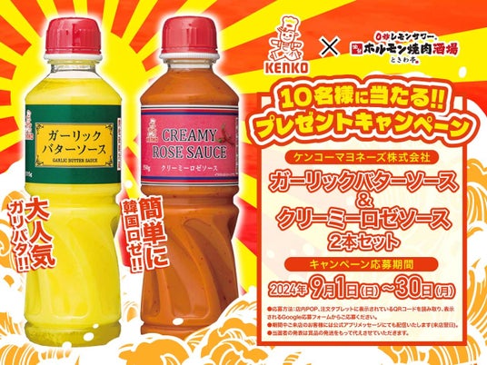 ケンコーマヨネーズ株式会社(本社:東京都杉並区、代表取締役社長:島本 国一、以下「当社」)は、GOSSO株式会社(本社:東京都渋谷区、代表取締役:藤田 建)が展開する「0秒レモンサワー(R)仙台ホルモン焼肉酒場 ときわ亭(以下「ときわ亭」)」と、当社の人気商品『ガーリックバターソース』を使ったコラボレーション企画を実施いたします。