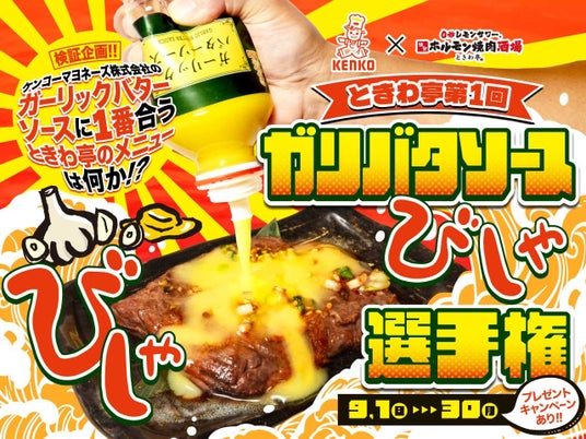 2024年9月1日(日)~30日(月)の期間中、ときわ亭の対象店舗(36店舗)にて、当社の人気商品である『ガーリックバターソース』の60分間かけ放題(税込275円)メニューが登場。ときわ亭のお肉に、芳醇なバターの風味にガーリックがガツンと香る『ガーリックバターソース』をびしゃびしゃにかけて、一番マッチして美味しくなるメニューを見つけていただく検証企画です。