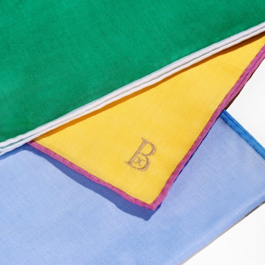「カラーカクテル」シリーズで取り扱う宝石からインスピレーションを受けたハンカチは、全20色の展開。どの宝石の色が手元に届くかも、お楽しみいただけます。