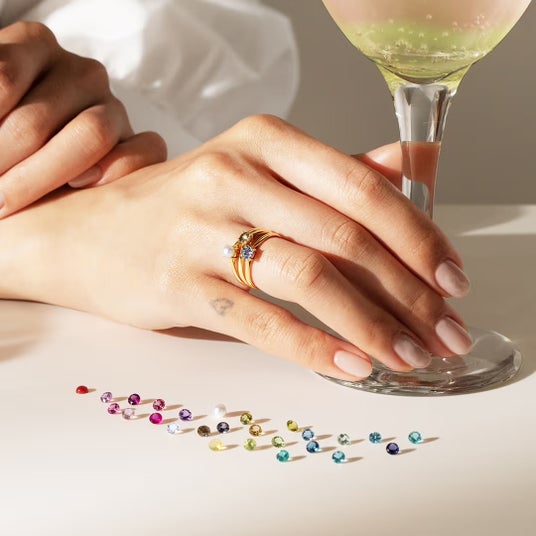 「カラーカクテル」は、全50色から選べる4ミリ大の宝石を主役に、ミニマルなデザインを楽しめるスキンジュエリーです。お気に入りのカクテルを作るように、お好きな色を重ねづけして、ファッションのポイントとしてもお使いいただけます。リング・ネックレス・ピアスの展開で、地金のカラーはイエローゴールド、ピンクゴールド、プラチナの3種からお選びいただけます。
