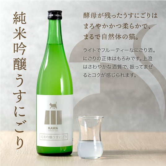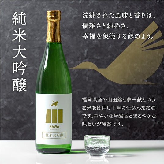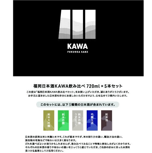 「日本酒 飲み比べセット 720ml 5本セット KAWA」のラインナップは、地元福岡の山田錦と夢一献という酒米を丁寧に仕込み、華やかな吟醸香とまろやかな味わいが特徴の純米大吟醸を始め、香りと旨味のバランスに優れた「純米吟醸」、酵母を残すことでライトでフルーティーなテイストの「純米吟醸うすにごり」、火入れをせずに瓶詰めすることでフレッシュな軽やかさが特徴の「吟醸生酒」、厳選された米の旨味と風味をしっかり感じることのできる「純米酒」と製法の異なる5本のラインナップとなっております。 またセットには、読みながら味わうことで日本酒の世界を楽しむことができる解説リーフレットもついております。