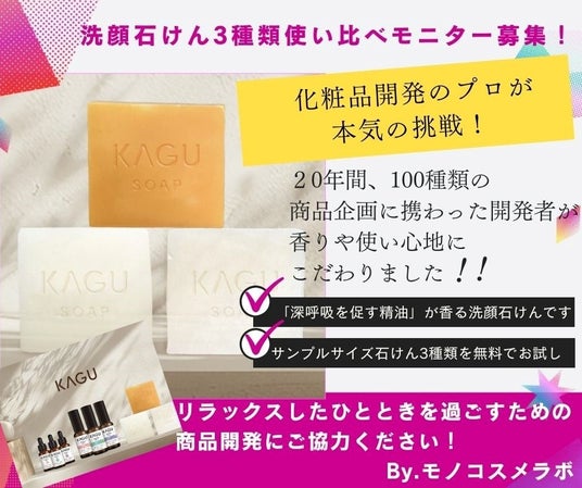 1. 化粧品開発のプロが、本気の挑戦! 「深呼吸を促す精油」が香る洗顔石けん3種類使い比べモニター募集