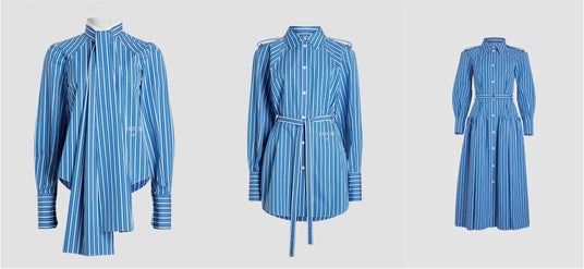 左からストライプブラウス(税込¥137,500)、ストライプミニドレス(税込¥165,000)、ストライプマキシドレス(税込¥253,000)