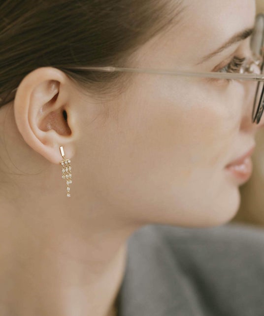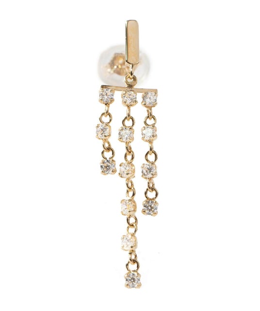3本の繊細なフリンジチェーンが優雅に揺れるデザインが特徴です。動くたびに煌めきを放つフリンジが、耳元に華やかなアクセントを加え、エレガントなスタイルを演出します。