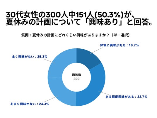 30代女性の300人を対象とした「夏休みの計画にどれくらい興味がありますか?」というアンケートで151人(50.3%)が「夏休みの計画について興味あり」という結果になりました。