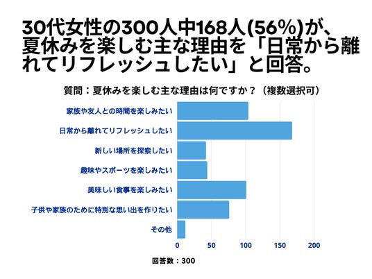 30代女性の300人を対象とした「夏休みを楽しむ主な理由は何ですか?」というアンケートで168人(56%)が「日常から離れてリフレッシュしたい」という結果になりました。