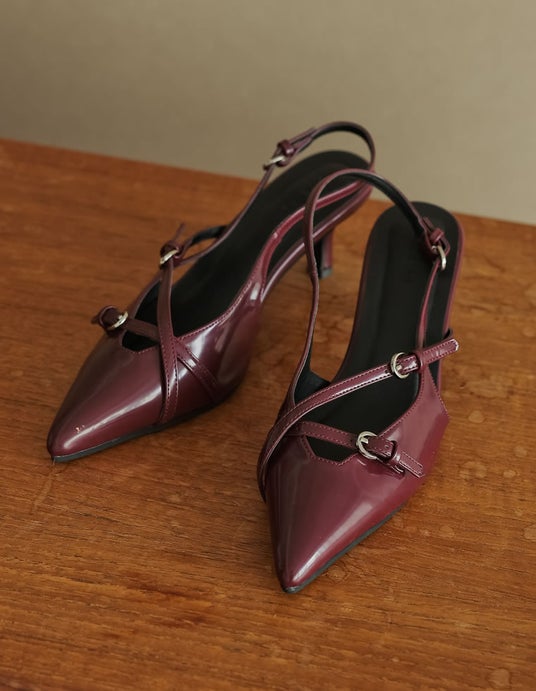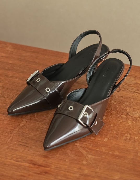 太ベルトのデザインとポインテッドトゥで、モードかつスタイリッシュに仕上げたミュール。