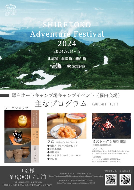 知床国立公園60周年・世界遺産20周年を記念して、アウトドアの魅力がたっぷり詰まったフェスティバルを開催します。アウトドアブランドのSnow PeakとTHE NORTH FACEの協力のもと、羅臼町と斜里町を舞台に自然を楽しみながら学べるイベントとなっています。