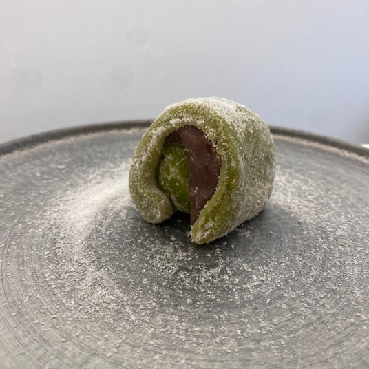 シャインマスカットの鮮やかな色と抹茶の皮の色が美しく調和した見た目も美しい一品です。