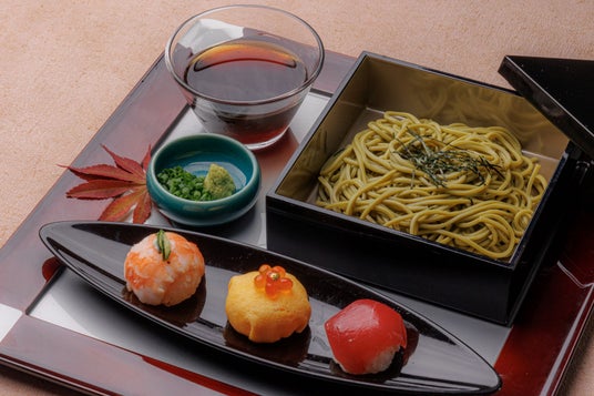 【オプション】茶そばと手毬寿司3種(海老手毬/玉子とイクラ手毬 /マグロ手毬) 1,200円