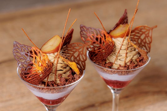 美しい紅葉をイメージした「カシスと和栗のモンブランパフェ」は、グロゼイユ(赤すぐり)・バニラのジュレ・カシスムースチョココーティングのフィアンティーヌの3層のベースに、モンブランクリーム、栗の渋皮煮、紅葉に見立てた葉っぱのチュイールで飾りを施した食べるのを躊躇ってしまうほどの繊細で美しい仕上げに。