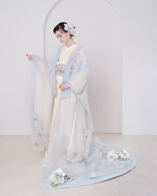 「葵衣」は爽やかな水色のオーガンジーにブルーグレーのチュールを合わせた打掛に、クリーム色の掛下着を合わせ、変化する繊細な色の表情にこだわりました。
