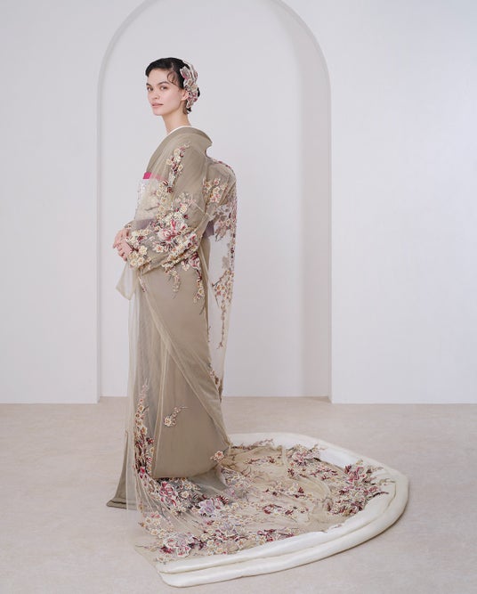 華やかなバックスタイルはドレスのトレーンさながらに教会のバージンロードにも映え、和洋どちらのテイストの会場でもご着用いただけます。オリジナルなスタイルを取り入れたい花嫁様へ、ぜひおすすめしたい逸品です。