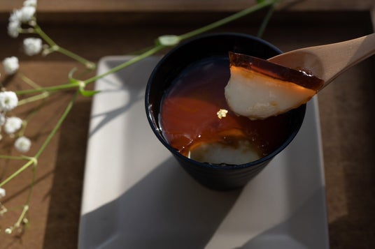 くず餅の原料である450日熟成した発酵小麦澱粉を牛乳、生クリームで練り上げ、まろやかでもっちりとしたスイーツに仕立てました。上には、船橋屋秘伝の黒蜜を使用したゼリーをかけて濃厚なお味に。最後に金箔をかけて上品さをプラスしました。