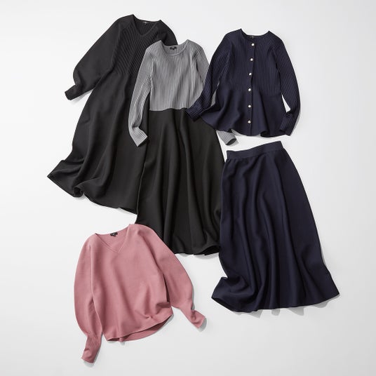 「ホールガーメント(R)Vネックフレアワンピース」は、タイトフィットな身頃とボリューム感のある袖とスカートのコントラストが立体的なフォルムをつくり、一枚でも華やかな着こなしが完成します。