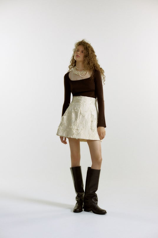 Jacket_¥27,500,Knit_¥23,100,Skirt_¥17,600,Shoes_¥15,400