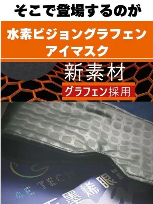 水素が石油に代わる次世代エネルギー候補の1つであることは、既に述べました。 地球の自然界に、水素原子は存在しませんが、酸素は大気中にあり、酸素と水素が結合している水は、地球上を覆う様にあります。 ですから、水から水素を抽出しなければなりません。今まで電気分解の電極は白金が使われてきたが、白金は非常に高価で、一般化して安価に大量に電気分解はできない。 そこで白金に変わる電極になるものを探していて、その候補の1つが「グラフェン」です。4Eテクノロジーは、ここに注目し、アイマスクとそのインナーシート両方に埋め込んだグラフェンで、アイマスクの中に微量の水素を発生させるメカニズムを開発し、このアイマスクが出現しました
