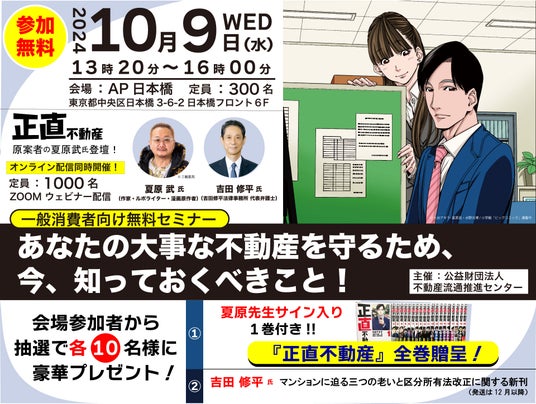 この度、(公財)不動産流通推進センターは、一般消費者を対象とした初めてのイベントとなる、「あなたの大事な不動産を守るため、今、知っておくべきこと!」を2024年10月9日(水) 13:20より、AP日本橋にて開催します。