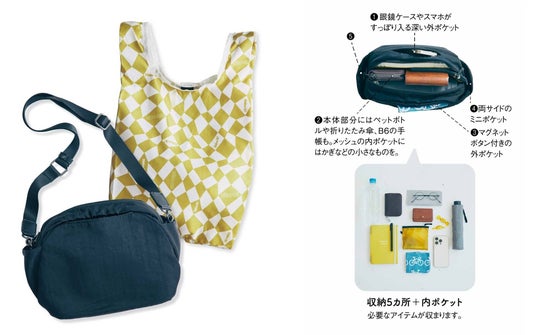 エコバッグ付きの、気持ちも足取りも軽くなるバッグ。身軽なお出かけを実践している金子敦子さんの基本の持ち物は「スマホ・眼鏡・かぎ」の3点。「これで充分だけど、お仕事や遠出するときは手帳や飲み物、折りたたみ傘も収まるといいなぁ」とアクティブ派な大人のリアルな本音も! それならば!というわけでできたのが、コンパクトだけどしっかりまちがあるこのショルダーバッグです。