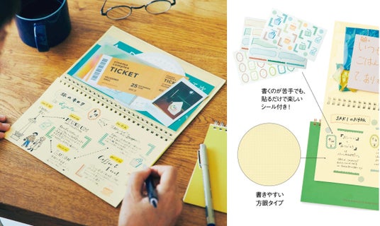 書くのが苦手でも大丈夫!貼るだけで楽しいシールと、裏にのりが付いた透明ポケットに残しておきたい大事なものをいれて、ノートに貼るだけでも完成。
