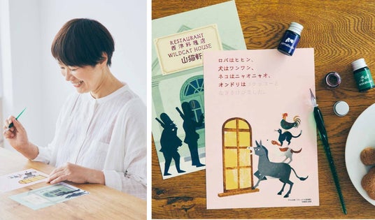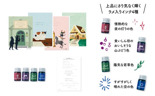 「最近インクにハマっている」という金子 敦子さんが、日常でも使いやすく味わいのある4色のインクをセレクト。<ブレーメンの音楽師>、<注文の多い料理店>、<吾輩は猫である>、<ヘンゼルとグレーテル>の、4つのなつかしい童話や文学のワンフレーズを、なぞり書きするだけで『飾りたくなる一枚』に仕上がります。