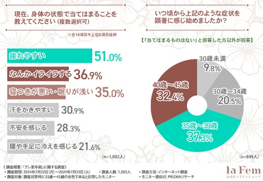 「現在、身体の状態で当てはまることを教えてください(複数選択可)」とチェックボックスの内容を用いて疲れやすい(51.0%)』と回答した方が最も多く、次いで『なんかイライラする(36.9%)』『寝つきが悪い・眠りが浅い(35.0%)』と続きました。