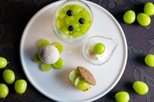 シャインマスカットの檸檬酒ゼリー寄せ/杏仁アイス シャインマスカットをのせて/シャインマスカットの烏龍茶フィナンシェサンド/シャインマスカットと蓮の実餡入りのココナッツ団子