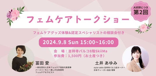 2024年9月8日(日)に一般社団法人日本フェムケア協会 代表理事 冨田愛氏とコラボし、style table 吉祥寺パルコ店 オーナー 土井あゆみが、質問を交えながらトークショーを開催します。