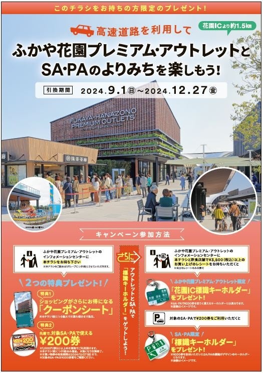 ふかや花園プレミアム・アウトレットは関越自動車道「花園IC」より約1.5kmに立地し、多くのお客様が高速道路を利用して来場します。本キャンペーンでは、アウトレットへの行き帰りに立ち寄りやすいSA・PA全15施設(上り/下り合計)を対象とし、対象SA・PAに設置されたキャンペーンチラシをふかや花園プレミアム・アウトレットに持参いただくと、アウトレット内で使えるクーポンシートと、「SA・PAお買い物券」をお渡しします。「SA・PAお買い物券」は、お帰りや次のお出かけの際に対象SA・PAで利用でき、さらに、利用した方には先着で、カプセルトイで人気の「標識キーホルダー」(該当施設のもの)をプレゼントします。また、アウトレット内の飲食店で3,500円以上お食事いただいた方には、本キャンペーンオリジナルの「花園IC標識キーホルダー」をプレゼント。「花園IC標識キーホルダー」は、ふかや花園プレミアム・アウトレットでしか手に入らない、数量限定のアイテムです。