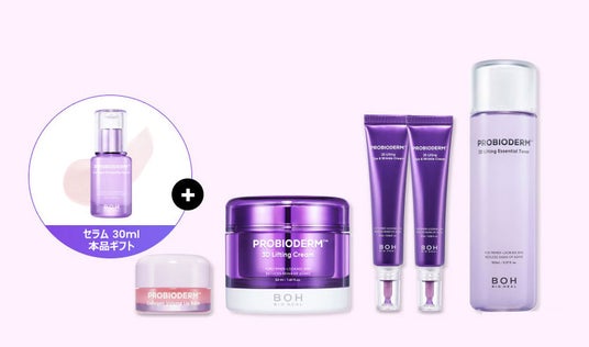 (左から)プロバイオダーム(TM)コラーゲンリモデリングセラム 30ml(ギフト)、プロバイオダーム(TM)コラーゲンボリュームリップバーム 15ml、プロバイオダーム(TM) 3Dリフティングクリーム 50ml、プロバイオダーム(TM)3Dリフティングアイ&リンクルクリーム 25ml×2(1+1)、プロバイオダーム(TM)3Dリフティングエッセンシャルトナー 150ml
