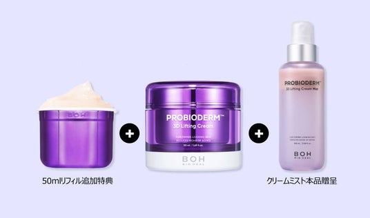 (左から)プロバイオダーム(TM)3Dリフティングクリーム 50ml×2(本品+リフィル)、プロバイオダーム(TM)3Dリフティングクリームミスト 100ml(ギフト)