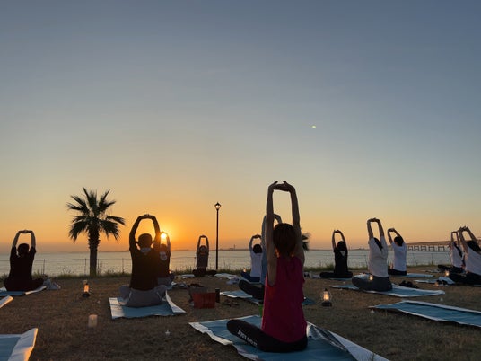 スポーツを通じ、心身、社会的にも健康な「ウェルビーイング」の増進につなげていくことを目的に、リゾート感たっぷりのシーサイドエリアでウェルネスイベントを開催しています。夕暮れに関西空港から飛び立つ飛行機を見ながら特別な雰囲気の中でヨガを体験できます。