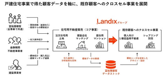 ランディックスグループは、富裕層顧客を対象に不動産領域のワンストップサービスを展開しています。主力事業は戸建住宅の販売であり、全成約の30%程度が紹介・リピート取引によって構成されています。注文住宅希望者への建築会社マッチング(sumuzu Matching)や、リピート取引となるお客様に向けた1棟収益用不動産の販売など、時代と共に変化するお客様のニーズに応え、「パーソナライズ」をキーワードに事業展開を行っています。