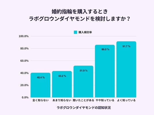 一方でラボグロウンダイヤモンドを「よく知っている」と回答した人の9割以上が婚約指輪にラボグロウンダイヤモンドを検討したいとの結果。認知度が高いほど購入意欲も高いという結果に。
