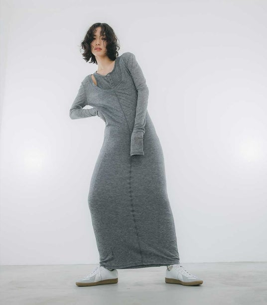 ROUND CUT MAXI DRESSレイヤード次第で様々なコーディネートを楽しめる、センシュアルなカットソーマキシワンピース。シアーカットソーのロングスリーブワンピースと、程よい厚みのリブタンクトップワンピースがセットになったアイテム。ネックラインを変えることで前後2WAYで着回せるデザインに仕上げています。ボートネック、深いUネックどちらで着てもデコルテが綺麗に見えるようパターンに拘った1枚。
