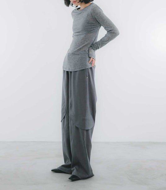 WAVE CUT SLACKSウェービーな切り替えが目を引くデザイン性の高いイージースラックス。肌触りが良くきれいな表面感を持ち合わせた、ストレッチ性のあるのツイル素材を使用したパンツ。しっかりとした肉感があるため身体のラインを拾いにくく、ノンストレスな履き心地が魅力です。カーブラインは履いた時のレッグラインが綺麗に見えるように計算されたパターン設計に拘っています。