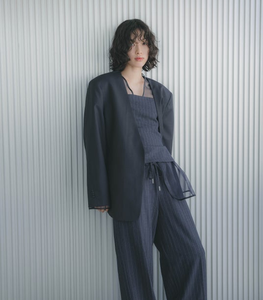 STRIPE STRAP BUSTIER ¥10,340 / DOUBLE WAIST STRIPE SLACKS ¥15,400 / GRAY. NAVY