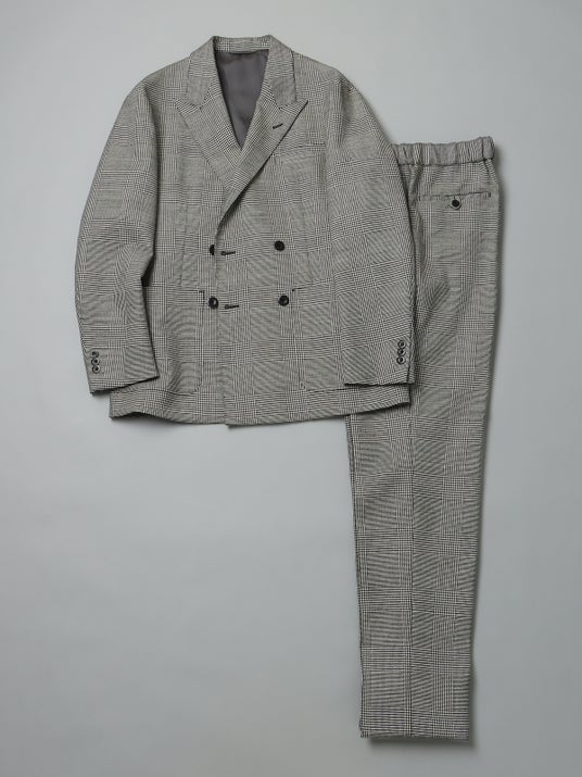 英国ヴィンテージ調を意識したクラシックなダブルジャケット。肩の丸みや軽くやわらかな仕立てなど、着る人の個性を生かす自然で上品な美しさを追求しています。パンツも10cm以上のウエスト調整幅を持ちながら、自然な見えがかりにこだわったシャーリング仕様です。