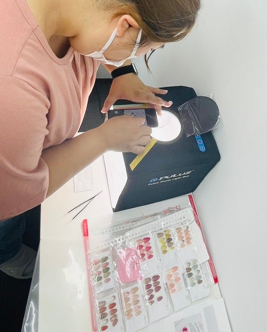つむぎ工房でリメイクされたネイルチップの次の行き先は「合同会社フルリール/福祉ネイルスペースPetal」にて、スマートフォンでの写真撮影と通販サイトのシステム入力を手掛けています。